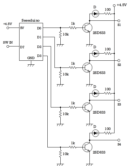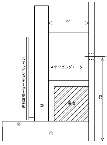 日本で"最初の電信が敷設されたのは、東京・築地の運上所(いまの税関)と横浜の裁判所の間で、1869(明治2)年12月のことである。このとき使われた電信機が、ダイヤル型電信機で、フランスから輸入されたブレゲー指字電信機であった。この電信機は、送信側でダイヤルを回し、文字を示すと、回転した数のパルスが受信側に伝わり、受信側のダイヤルを回して文字を指し示すというものであった。 筆者はかねてから、このダイヤル型電信機を作ってみたいと思っていたが、回転機構に時計で使われる脱進装置が必要になり、とても筆者の工作の技量では無理だと諦めていた。今回、書籍に紹介することを目的に、このダイヤル型電信機の製作を試みた。機械的な機構ではなく、ステッピングモーターとマイコンでの制御という今様のものだが、なんとか実現したので、以下に紹介したい。 図1 ブレゲー指字電信機(1)送信機の製作 送信機は、回転するたびにパルスを発生させる機構である。今回は図1のようにアルファベットを指字するのではなく、数字のみを扱うように簡素化した。これなら円周を10分割すればよい。これでも電信の機構は理解できると考えたからである。アルファベットにチャレンジしたい人は26分割すればよい(実際の電信機はJがなく、代わりに+が入っている)。 送信側のパルス発生機構には、図2のような円形カムを製作した。厚さ4mmの合板である。これに軸を取り付けて動くようにした。スイッチには小型のリミットスイッチが手元にあったのでこれを使用した。また、スイッチだけだとステップごとに回転が止まらないため、プラ板でバネ機構を作り、これを円形カムにかませた。写真や図を以下に示す。 図2 円形カム 図3 軸の加工 図4 スイッチとプラ板で作ったバネこれらのパーツを、135×135×12の合板の土台上に組み立てた。土台には中心にφ5.2の穴を深さ2mmであけておく。スイッチとバネの位置は現物合わせで決めた。覆いとなる板は、4mm厚の合板を100×100のものと100×21(2枚)で「コ」の字型に接着して作った。100×100の板には中央にφ5.2の穴をあけておく。円板状の文字は「花子」というソフトで作成し、シール用紙に印刷、切り抜いて貼り付けた。 図5 送信機の機構 図6 送信機の外観ターミナルは、陸軍ターミナルと称するものが手元にあったのでこれを使用した。土台にターミナルのナットが入る六角形の穴を2mmほどの深さにあけ、ここにナットを押し込んで、ターミナルのネジを入れた。木ネジなどでターミナルをつくり、ワニグチクリップが付いた線を使ってもよい。 (2)受信機の製作 受信機は、ほとんど電子工作となってしまった。 全体の回路図を図7に示す。マイコンは小型のSeeeduinoを使用した。マイコンにはステッピングモーターを駆動するだけの能力がないので、駆動回路をトランジスタで作った。 図7 モーター駆動回路ステッピングモーターは手元にあったオリエンタルモーターのPX243M-01Aというものである。針を回すだけにしては少々大きいが、手持ちで一番駆動電圧が低かったのがこれだった。5Vくらいの駆動電圧で安価なステッピングモーターは入手可能なので、製作される方はそれを使うとよい。このモーターの仕様は4V,0.9A、0.9度/stepというものである。1回のパルスで0.9度進む。ステッピングモーターの駆動方法にはいくつかの種類があるが、今回は針を回すだけなので、最も簡単な駆動方法である「1相ユニポーラ励磁」(図8参照)を使った。簡単で、駆動電流が最も少なくてすむ。図でCWはクロックワイズ(時計回り)、CCWはカウンタークロックワイズ(反時計回り)である。 図8 ステッピングモーターの駆動方法これらを130×60×4の合板の土台に、100×100×12の合板を垂直に取り付けて、モーターと回路基板を取り付けた(図9,10)。 図9 図10取り付けたモーターの下には電池ボックスが入る。こうした構造にしたのは、受信機の外箱から簡単に取り出すことができるようにするためである。図10の基板の一番下にマイコンが取り付けてある。プリント基板はユニバーサル基板ICB-93Sを使用した。配置と配線は図11を参照されたい。図は部品面から見た図である。 図11 配置と配線図受信機の外箱は、図12,13の通りである。 図12 受信機の外箱(正面図) 図13 受信機の外箱(側面図)図中で、①は130×75×12、②:130×75×5、③:100×100×12である。外箱の正面に使用した板は、130×120×4で、モーターの軸部分にφ5.2の穴をあけてある。②と③は木ネジ止め、その他はボンドで接着した。 側面の板には120×75×4(2枚)を使用し、正面から見て右側の側板には、ターミナルと駆動回路全体をON/OFFする電源スイッチを取り付けた。完成図を図14に示す。 図14 ダイヤル型電信機プログラムはArduino IDEで作成し、転送した。電源には単3電池3本(4.5V)を使用した。プログラムを参考までにあげておく。