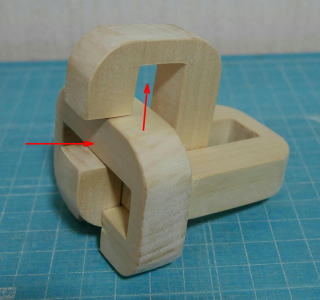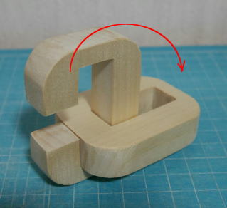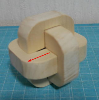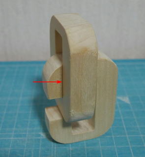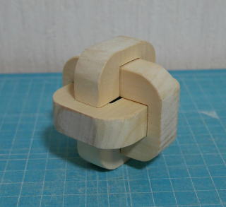 芦ヶ原氏が訳した『悪魔のパズル』という本の中に、三本組木のパズルがいくつか掲載されている。原理はほぼ同じなので、その中の一つ「デュボアの三本組木」を作ってみた。デュボアは、Philippe Duboisのことで、スイス生まれのイスラエル在住とある。このパズルは、厚さを1とすると、横幅が3、長さが4の比率のピースで構成されている。筆者は手元に厚さ15mmの白木の板があったので、15mmを基準として製作した。作られる方は、入手できる板厚を基準にして寸法を決めるとよい。 図1 完成したパズルピースは2種類あり、英字のOとCに見えるので、以下この呼び名を使う。工作ではできるだけ正確に作ることだが、若干のゆとりをもたせないと汲むことができないのも事実である。最終的には組んでいく中で修正するしかない。 ![]() 図2 ピースの寸法どちらのピースも中央に穴をあけないといけないので、筆者は糸のこを使ってだいたいの形にまず切り抜いた。刃をターンさせる位置にφ3.5のドリルで穴をあけておいた。 図3 中央の穴の下処理あとはノミやヤスリを使って整形する。できるだけ労力が少ない手段を選んで加工したい。最終的にはヤスリで合わせるしかない。 図4 完成したピース【組み方】 このパズルは、組み上げていく中で2回の移動が必要になる。以下に、組み方の写真を掲載しておく。 (1)CのピースにOのピースを入れる。 ![]() (2)Oのピースを90°回転する。幅の狭い方が外側になる。OをCの下の溝に押し込む。 ![]() (3)Cのピースを入れ、Oのピースとともに上に押し上げる。 ![]() (4)Oのピースを左に動かす。これで完成。 ![]() 【参考】 『悪魔のパズル』(原題The Book of Ingenious & Diabolical Puzzles),J.Slocum & J.Botermans、芦ヶ原伸之訳、日経サイエンス社、1995.12 |