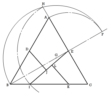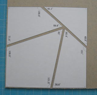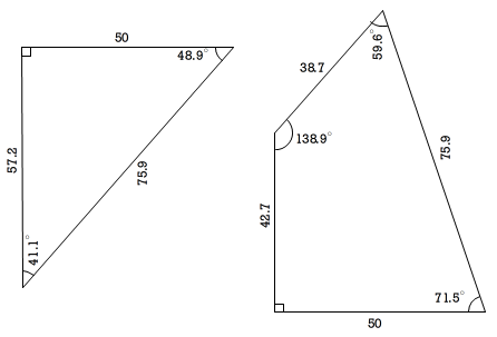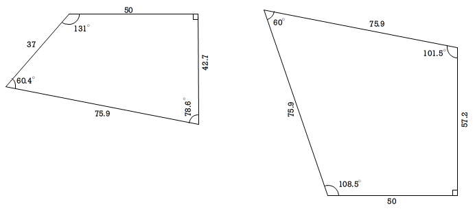 『The Puzzling World of Polyhedral Dissections』という本に出ていた、「Geometrical Dissections」(幾何学的分割)というパズルがある。これは幾何学図形を分割したピースを使って、別の図形を作るものであるが、これでよく知られているのが、1902年にHenry Dudeneyが正方形を分割して、正三角形を作るという分割法を考案した。ネットで調べると、これ自身が数学的研究対象になっているようなので、理論的な事を知りたい方は調べてみられるとよい。ここではパズルとして、アクリル板を使ったピース作成について述べることとする。 図1 加工したピース最初に、分割についての説明をしておく。前述の本には、正方形の1辺を1としたときに、変換してできあがる正三角形の1辺が2/4√3(分子が2,分母は4乗根3)としか書かれておらず、分割法の詳細が不明であった。ネットで調べたところ、次のように作図する方法を見つけた。こちらは正三角形から分割する方法について書かれてる。 図2 分割法の説明(1)正三角形ABCを作図する(作図法はおわかりかと思うのでパスする)。D、Eは辺の中点である。 (2)BEを結ぶ線分を引く。線分は延長しておく。AEを半径とする円を描き、線分BEの延長との交点をFとする。 (3)線分BFの中点をGとする。Gを中心にBGを半径とする円を描く。線分ACの延長との交点をHとする。 (4)Eを中心にEHを半径とする円を描く。BCとの交点をIとする。IとEを結ぶ。 (5)Dを通り、線分EIに垂直な線をひく。 (6)Iより線分AEの長さをとり、この点をKとする。Kを通り、EIに垂直な線分を引く。 以上の作図より、四角形ADIE、四角形DBIJ、四角形ELKC、三角形LIKの4つがピースである。 筆者は、正方形の一辺が100mmになるようにした場合のピースをパソコンの簡易CADで作成した。これを図3に示す。ただし、各部の寸法と角度は作図したものから求めているので、誤差がある。製作上は問題はあまりないと思う。 図3 ピースの寸法![]() 筆者は、これらのピースを印刷して2mm厚のアクリル板にはりつけて加工した。 図4 ピースの型紙をはりつけた図4をみれば、正方形の方の解答はわかる。正三角形については図1を参照のこと。これらを参考にピースがうまく収まるように調整されたい。 遊ぶときは、もちろんピースはバラバラの状態でわたすこと。ピースに1個所ずつ直角のところがあるので、正方形はわかりやすいと思われる。 【参考】 ・『The Puzzling World of Polyhedral Dissections』Stewart T.Coffin, 1998Edition ・https://polyhedr.com/dudeny-dissection.html |