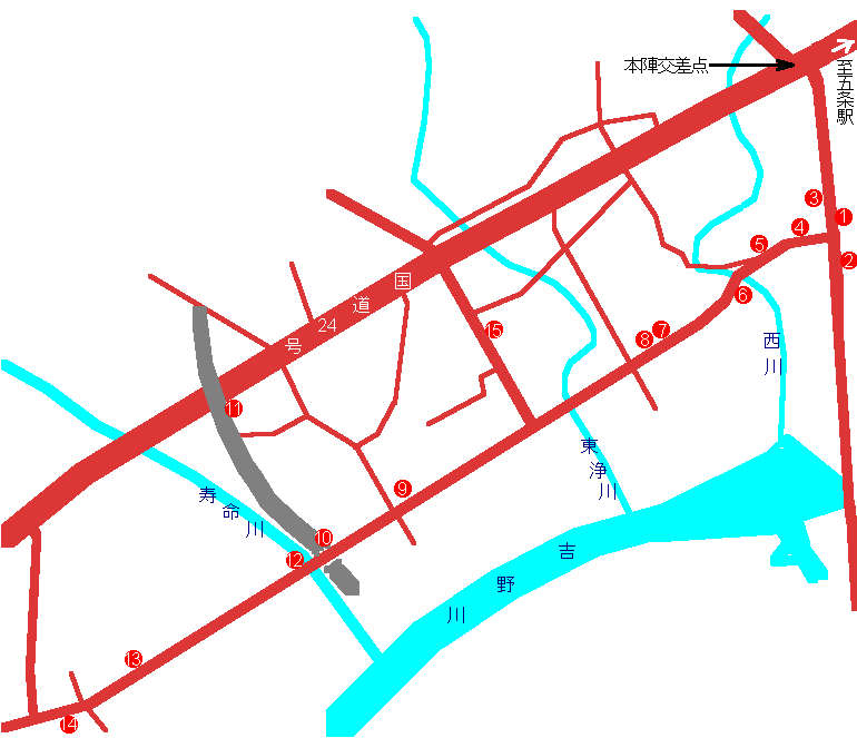 奈良県の五條は、御霊神社の御旅所を中心に町並みが形成され、1795年には代官所が設置され、南大和地方の政治経済の中心として発展した。 今回訪問した五條市新町の町並みは近世から近代の建築物で構成され、吉野川北岸を併走する旧紀州街道沿いに、当時の様子をよく残している。 明治・大正期に作られた洋風建築は少ない。しかし、しっくいで固められた和建築も、揃うとなかなかの風情である。 新町通りに沿って町屋が並ぶ。JR五条駅を出ると、広場の向かい側に感光案内所がある。ここで「五條新町」というパンフレットをもらっていくとよい。 駅からから南に向かって歩き、24号線との交差点を右に歩いて行くと「本陣」交差点に到着するので、この交差点を南に行くと、1分も歩かないうちに左右に古い建物が現れる。右側に道を曲がれば、そこが新町通りである。 建物のタイトルのうしろにある番号と地図上の番号が対応している。 ![]() |