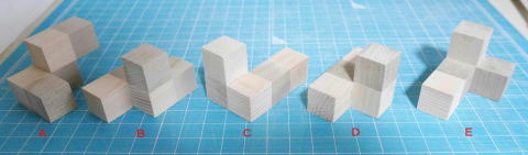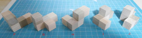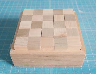 このパズルは、スローカムとボタマンズの『悪魔のパズル』(芦ヶ原伸之訳)に出ていたもので、1983年にSrewart T.Coffinが作ったパズルである。5つの立方体を組み合わせたピースを5×5の2段の箱に収めるというものである。単に収めるだけならば19264通りの解があるそうだが、市松模様の解はたった一通りしかないそうだ。 「東急ハンズ」に15mmの立方体木材が50個入ったセット(ヒノキ15角サイコロ50入:396円)とそれとは異なる木材で作られた36個入りのセット(コロコロ15×15×15 36入:220円)¥が販売されていたので、これを使って各キューブを貼り合わせて作ることにした。材料の色が異なるので、特に塗装することはしなかった。製作にあたって注意することは、立方体の大きさが微妙に異なるので、なるべく同じ寸法のものをセレクトして使用することである。それでも合わないときは、ヤスリで削って合わせる。 図1 製作の参考にした本図2 製作したピース 材料を図5、図6の形に接着するだけなので、特に難しいところはない。ピースはすべて5つの立方体から成る。色が異なるものはその通りに組み合わせないと、正解が得られなくなるので注意のこと。 ![]() 図3 ピースA~E ![]() 図4 ピースF~J 製作したピースを以下に示す。 図5 ピースA~E 図6 ピースF~J ピースを収めるケースは5mm厚のアガチス材で作った。底板は4mm厚のベニヤである。図面を以下に示す。 図7 箱に収めた状態15mmのキューブで作ったので、理想では75mm角の入れ物でよいはずだが、やはりキューブの寸法にバラツキがあり、内径を77mmとした。側板は図8を参照されたい。底板はベニヤなどを87×87の正方形に切り取って使用する。 図8 箱の図面パズルの正解は、参考にした本にあるので、ここには書かない。 【参考】 『悪魔のパズル』J.Slocum,J.Botermans、芦ヶ原伸之訳、日経サイエンス、1995.12 |