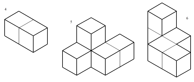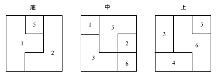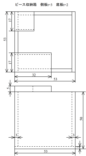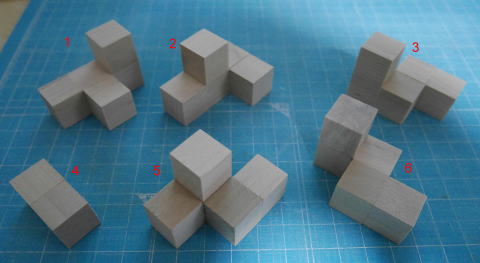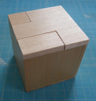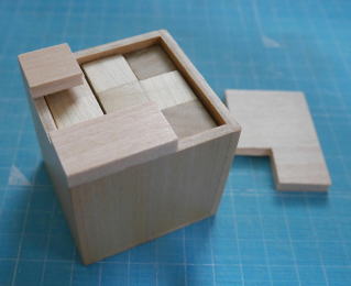 図1 箱に収められたピースこのパズルはCoffinの”AP-ART"の第5部”More Design in AP-ART"に出ていたパズルで、”Doubleplay"という。なぜこう呼ぶかというと、6つのピースをまず箱の外で、3x3x3の立方体に組むこと、そしてさらに箱の中にピースを収めること、この2つの課題をこなしてもらうためにこういう名前が付いた。Coffinは「どちらも難しい課題」といっている。 この第5部は元々"More Design in AP-ART, The Sculptural Art That Comes Apart"というタイトルでAP-ARTの別冊として2015年に出版されたものである。 筆者は、ピースを東急ハンズで販売されている15mm角の立方体が36個入ったものを使用した。このキューブはかなり精度がよくできている。5つのピースは5個のキューブを組み合わせたもので、1つだけ2このキューブを組み合わせたピースがある。各ピースの構成を以下に示す。ピースの番号は、箱に収める際に重要なヒントとなっている。 ![]() 図2 ピースの寸法図 図3 加工したピースいくつかのピースが0.3mmほど大きかったので、これを15mmに収まるように修正をした。角をなめらかにし、椿の実のオイルを表面に塗っておいた。 ピースを収める箱の寸法を以下に示す。筆者は内径46mmで製作した。フタは5mm厚の桜材を使用した。これも東急ハンズの「木のハガキ」を使用したものである。フタはスライドできるように溝を彫ってみたが、やはり素人の仕事まるだしの出来だった。 図4 ピースを収める箱の寸法 図5 フタの寸法 図6 ピースを収める箱以下に解答を示す。箱の外については図7でわかると思われるが、箱に収めるには一工夫が必要となる。 図7 解答図ピースを箱に収めるには、まず箱を下図のように置く。収める順番はピースの番号順である。ピースの図に上1とか下1とかあるのは、上1は上に突き出たピースが1つあるという意味で、下1は下にピースが1つ突き出ているという意味である。平面図だけではピースの向きがわかりにくいのでこのように記した。 ![]() (1)ピース1を下図のような向きで箱に入れ、入ったら矢印の向きに回転させ、左端に収める。 ![]() (2)ピース2を下図のような向きで箱に入れ、入ったら矢印の向きに回転させ、右端に収める。 ![]() (3)ピース3を箱の下側にあるガード板にすべりこませるように入れるとピースが収まる。入ったら左端へスライドさせる。 ![]() (4)ピース4を下図のような向きで入れ、入ったら左下へスライドさせる。 ![]() (5)ピース5を下図のような向きで入れる。そのまま収まる。 ![]() (6)ピース6を下図のような向きで入れる。そのまま収まる。 ![]() 【参考】 "AP-ART A Compendium of Geometric Puzzles"https://www.puzzlemuseum.com/puzzles/coffin-ap-art/ap-art-2018.pdf |